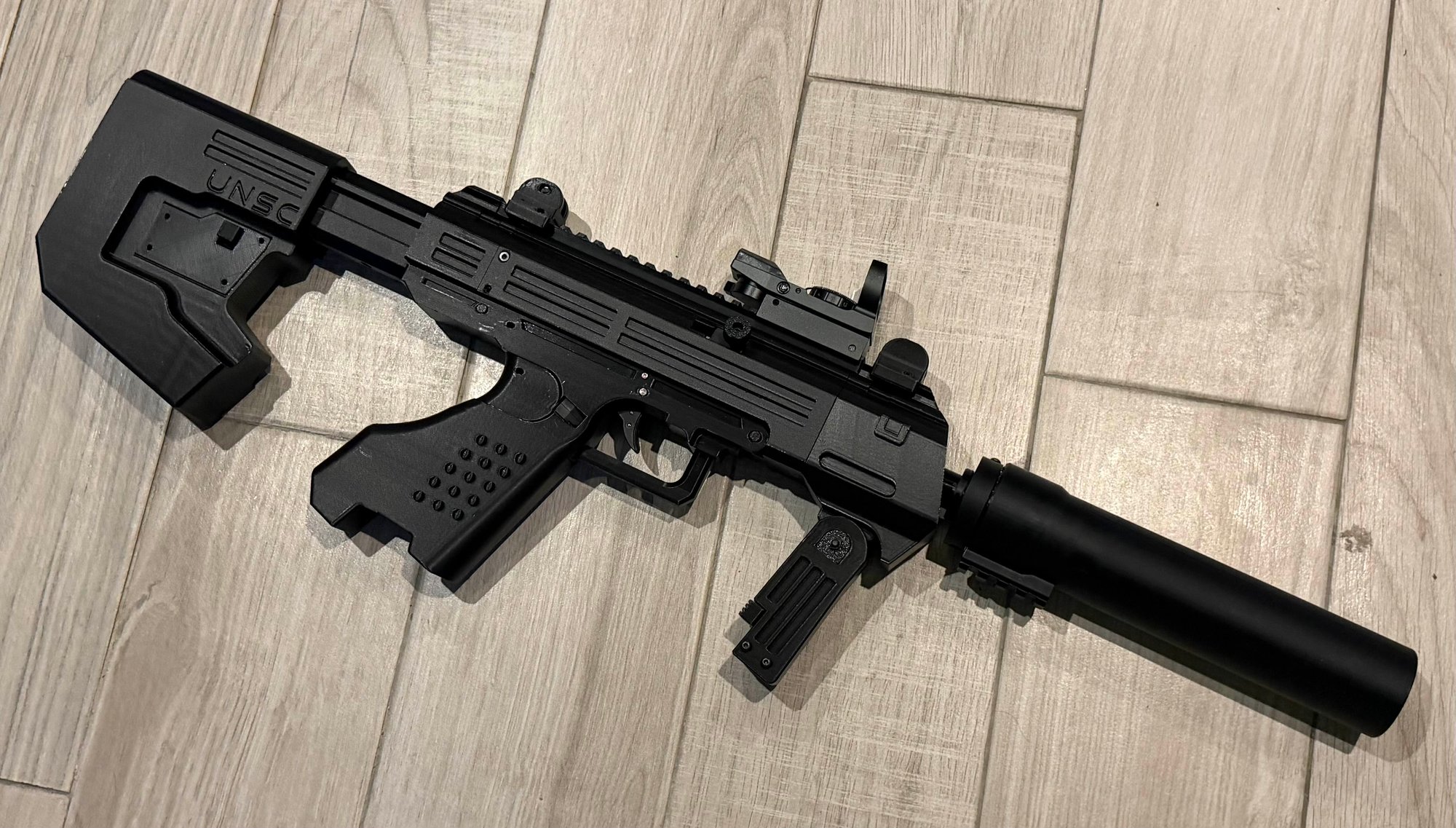 World's first true gas blowback M7S replica for airsoft. This replica is based on the M7/S SMG from Halo, replicating a bunch of the features present in game: side loading magazine, folding foregrip, collapsing stock, attachable suppressor.